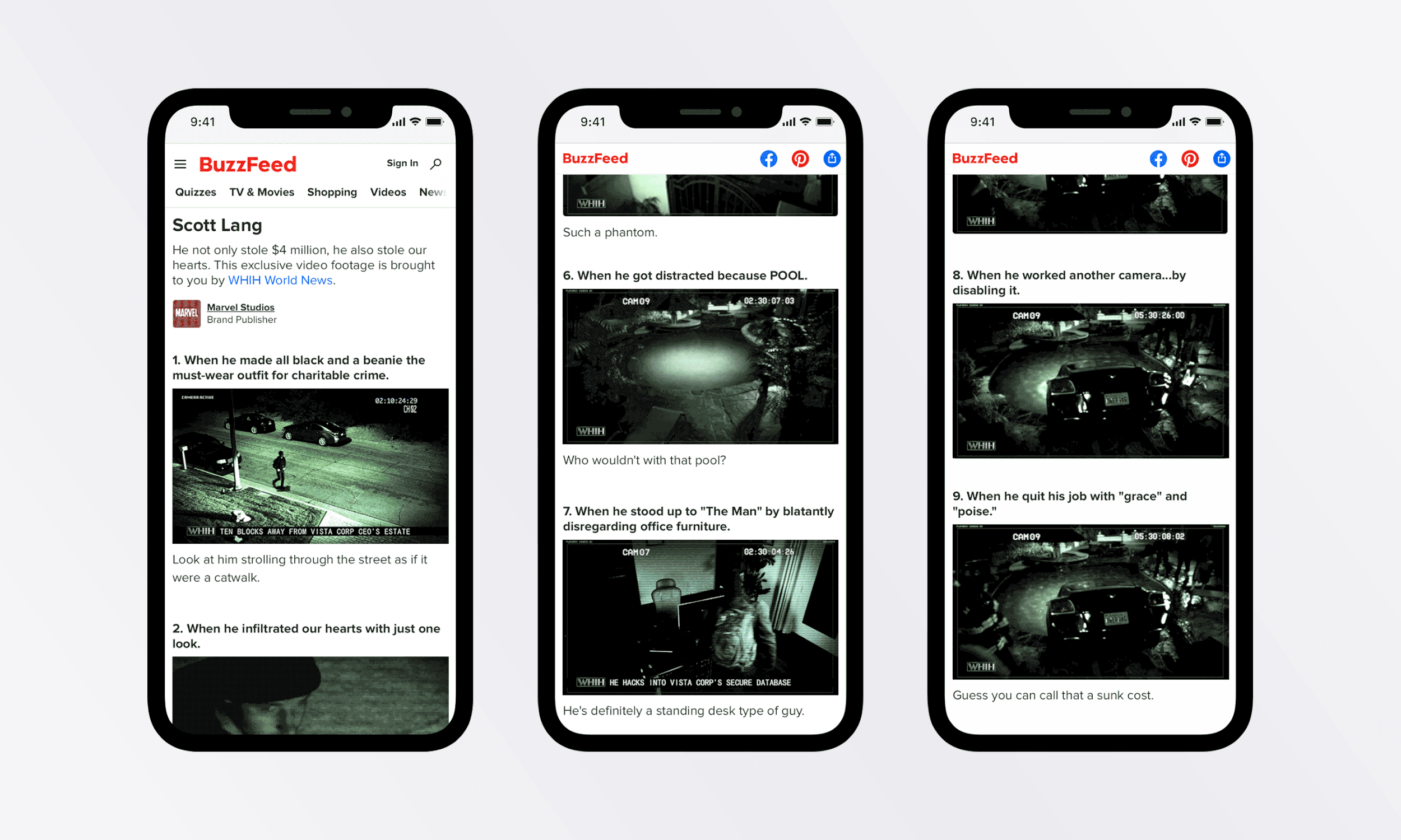 To launch the film Ant-Man, we created a “backstory” campaign that helped Google and Marvel blur the lines between the Marvel Cinematic Universe and the real world. We created unique social channels for key characters and corporations in the film, and tapped relevant media players like Buzzfeed, Mashable, Wired, and Marvel’s proprietary news channel WHiH to push our original content and narrative onto newsfeeds.